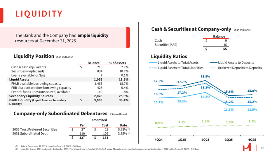 19 LIQUIDITY 4Q24 1Q25 (1) Rate at December 31, 2025, based on 3 - month SOFR + 166 bps (2) Issued in August 2021 and due in September 2031. The interest rate is fixed at 3.75% for 5 years. The rate resets quarterly commencing September 1, 2026 to the 3 - month SOFR + 310 bps. 15.1% 15.3% 16.3% 17.9% 17.7% 18.9% 15.6% 15.8% 16.9% 17.2% 18.3% 15.2% 13.5% 15.2% 13.5% 0.9% 1.1% 1.3% 1.3% 1.3% 2Q25 3Q25 4Q25 Liquid Assets to Total Assets Liquid Assets to Total Liabilities Liquid Assets to Deposits Brokered Deposits to Deposits Liquidity Position 㸦 $ in millions 㸧 Cash & Securities at Company - only 㸦 $ in millions 㸧 Company - only Subordinated Debentures 㸦 $ in millions 㸧 Liquidity Ratios % of Assets Balance 2.7% 213 $ Cash & cash equivalents 10.7% 834 Securities (unpledged) 0.1% 7 Loans available for Sale 13.5% 1,055 Liquid Assets 18.7% 1,463 FHLB available borrowing capacity 5.4% 425 FRB discount window borrowing capacity 1.8% 140 Federal funds lines (unsecured) available 25.9% 2,028 Secondary Liquidity Sources 39.4% 3,083 $ Bank Liquidity (Liquid Assets + Secondary Liquidity) Balance 9 $ Cash 46 Securities (AFS) 55 $ Amortized Rate Cost Par 5.38% 22 $ 27 $ 2036 Trust Preferred Securities 3.75% 109 110 2031 Subordinated Debt 131 $ 137 $ The Bank and the Company had ample liquidity resources at December 31, 2025. (1) (2)