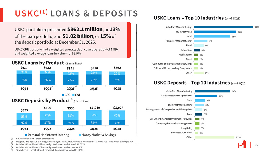 USKC ( 1 ) LOANS & DEPOSITS USKC portfolio represented $862.1 million , or 13% of the loan portfolio, and $1.02 billion , or 15% of the deposit portfolio at December 31, 2025. USKC CRE portfolio had a weighted average debt coverage ratio (2) of 1.99x and weighted average loan - to - value (2) of 53.9%. USKC Loans – Top 10 Industries (as of 4Q25) 31% 22% 19% 7% 5% 3% 2% 2% 2% 2% 5% Auto Part Manufacturing RE Investment Hotel Polyester Manufacturing Food Education Golf Course Steel Computer Equipment Manufacturing Offices of Other Holding Companies Other 24% 15% 7% 6% Auto Part Manufacturing Electronics/Home Appliances Steel RE Investment/Leasing 5% Management of Companies and Enterprises 5% Food 3% All Other Financial Investment Activities 3% Company/Enterprise Management 3% Hospitality 2% Electrical Auto Parts 27% Other 22 USKC Deposits – Top 10 Industries (as of 4Q25) $937 24% 76% $932 24% 76% $841 23% 77% $910 24% 76% $862 25% 75% 4Q24 1Q25 3Q25 4Q25 USKC Loans by Product 㸦 $ in millions 㸧 USKC Deposits by Product 㸦 $ in millions 㸧 $1,024 $1,040 $950 $823 $969 60% 31% 57% 34% 61% 35% 53% 57% 42% 37% 4Q25 3Q25 2Q25 4Q24 1Q25 Demand Noninterest - bearing Money Market & Savings (1) U.S. subsidiaries of Korean corporations (2) Weighted average DCR and weighted average LTV calculated when the loan was first underwritten or renewed subsequently (3) Includes $20.0 million CRE loan designated nonaccrual at March 31, 2025 (4) Includes $11.0 million CRE loan designated nonaccrual at June 30, 2025 (5) Time deposits, not illustrated, represent the remainder to add to 100%. (5) (3) (4) 2Q25 CRE C&I