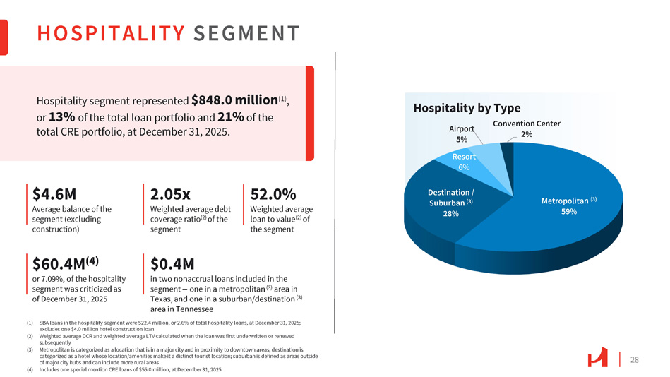 Rate Distribution Portfolio by State Fixed 69% Variable 31% OFFICE LOAN PORTFOLIO 27 (1) Segment represents exposure in CRE and excludes construction. 5.1% of the portfolio was owner occupied (2) SBA CRE office loans were $10.1 million, or 2.0% of total office loans, at December 31, 2025 (3) Weighted average DCR and weighted average LTV calculated when the loan was first underwritten or renewed subsequently (4) Includes $10.2 million CRE loan designated nonaccrual at December 31, 2025 The CRE office portfolio (1) was $503.3 million (2) at December 31, 2025, representing 8% of the total loan portfolio. $4.2M Average balance of the portfolio 2.05x Weighted average debt coverage ratio (3) of the segment 53.7% Weighted average loan to value (3) of the segment 37.1% of the portfolio is expected to reprice in 1 to 3 months 2.02% of the office portfolio was delinquent 2.20% of the office portfolio was criticized (4) Remaining = 3% 82% 8% 2% 5%