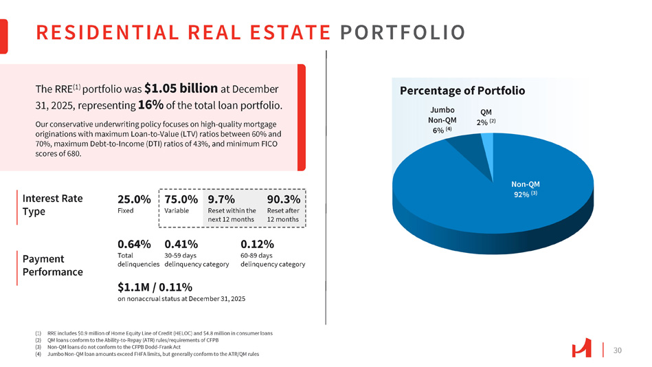 30 Payment Performance RESIDENTIAL REAL ESTATE PORTFOLIO The RRE (1) portfolio was $1.05 billion at December 31, 2025, representing 16% of the total loan portfolio. Our conservative underwriting policy focuses on high - quality mortgage originations with maximum Loan - to - Value (LTV) ratios between 60% and 70%, maximum Debt - to - Income (DTI) ratios of 43%, and minimum FICO scores of 680. 25.0% Fixed Non - QM 92% (3) Jumbo Non - QM 6% (4) QM 2% (2) (1) RRE includes $0.9 million of Home Equity Line of Credit (HELOC) and $4.8 million in consumer loans (2) QM loans conform to the Ability - to - Repay (ATR) rules/requirements of CFPB (3) Non - QM loans do not conform to the CFPB Dodd - Frank Act (4) Jumbo Non - QM loan amounts exceed FHFA limits, but generally conform to the ATR/QM rules Interest Rate Type 75.0% Variable 0.64% 0.41% Total 30 - 59 days delinquencies delinquency category 9.7% 90.3% Reset within the Reset after next 12 months 12 months 0.12% 60 - 89 days delinquency category $1.1M / 0.11% on nonaccrual status at December 31, 2025 Percentage of Portfolio