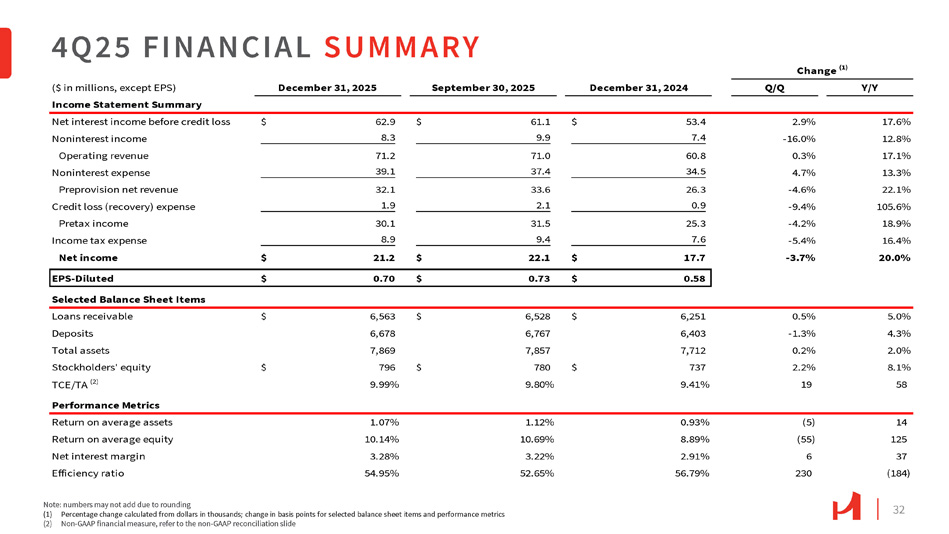 4% 3% 5% Remaining = 46% 12% 11% 4% 8% 4% 3% EQUIPMENT FINANCE PORTFOLIO 31 Transportation 19% Construction 15% Waste Management 13% Manufacturing 12% Retail Trade 6% Professional Services 6% Wholesale Trade 4% Hospitality 4% Healthcare 5% Other Services 4% Portfolio by Industry Ot ( h 1) er 12% (1) Other includes agriculture and real estate of 3% and 3%, respectively Equipment finance portfolio represented $408.5 million , or 6% of the loan portfolio, at December 31, 2025 7% 7% 6% 5% 5% 4% 4% 4% Portfolio by Equipment 28% 30% Portfolio by State