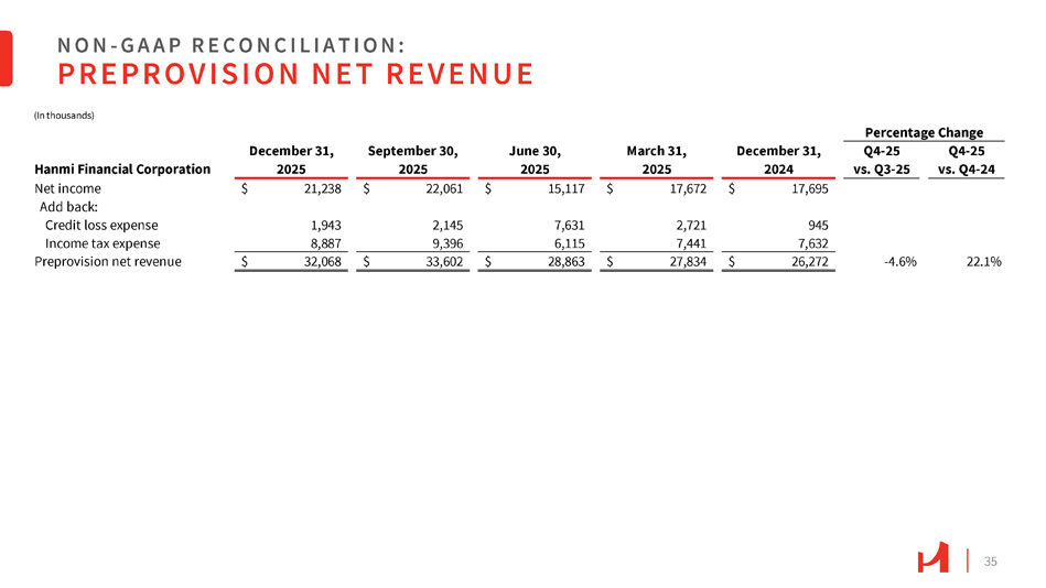 33 NON - G A A P R E C O N C I L I A T I O N : TANGIBLE COMMON EQUITY TO TANGIBLE ASSET RATIO (1) There were no preferred shares outstanding at the periods indicated December 31, March 31, June 30, September 30, December 31, 2024 2025 2025 2025 2025 Hanmi Financial Corporation 7,677,925 $ 7,729,035 $ 7,862,363 $ 7,856,731 $ 7,869,185 $ Assets (11,031) (11,031) (11,031) (11,031) (11,031) Less goodwill and other intangible assets $ 7,666,894 $ 7,718,004 $ 7,851,332 $ 7,845,700 $ 7,858,154 Tangible assets 732,174 $ 751,485 $ 762,834 $ 779,550 $ 796,386 $ Stockholders' equity (1) (11,031) (11,031) (11,031) (11,031) (11,031) Less goodwill and other intangible assets 721,143 $ 740,454 $ 751,803 $ 768,519 $ 785,355 $ Tangible stockholders' equity (1) 70,342 60,035 54,541 48,004 43,277 Add AFS securities AOCI $ 791,485 $ 800,489 $ 806,344 $ 816,523 $ 828,632 Tangible stockholders' equity without AFS securities AOCI (1) 9.54% 9.72% 9.70% 9.92% 10.12% Stockholders' equity to assets 9.41% 9.59% 9.58% 9.80% 9.99% Tangible common equity to tangible assets (TCE/TA) (1) 10.32% 10.37% 10.27% 10.41% 10.54% TCE/TA (w/o AFS securities AOCI) (1) 30,195,999 30,233,514 30,176,568 29,975,371 29,894,757 Common shares outstanding $23.88 $24.49 $24.91 $25.64 $26.27 Tangible common equity per common share (In thousands, except share, per share data and ratios)