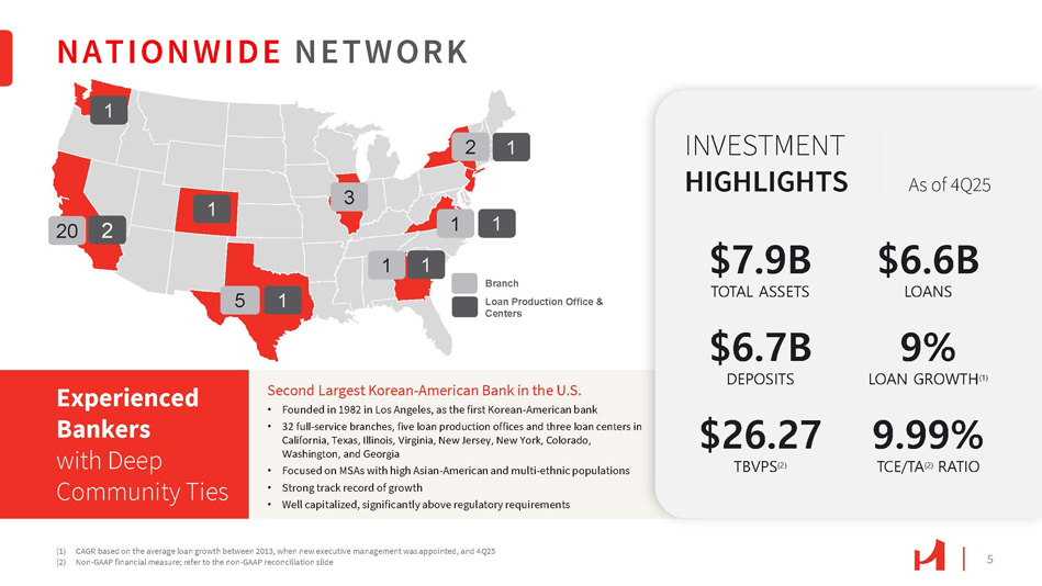 Second Largest Korean - American Bank in the U.S. • Founded in 1982 in Los Angeles, as the first Korean - American bank • 32 full - service branches, five loan production offices and three loan centers in California, Texas, Illinois, Virginia, New Jersey, New York, Colorado, Washington, and Georgia • Focused on MSAs with high Asian - American and multi - ethnic populations • Strong track record of growth • Well capitalized, significantly above regulatory requirements Experienced Bankers with Deep Community Ties 3 1 1 1 1 5 1 NATIONWIDE NETWORK 1 2 Branch Loan Production Office & Centers 1 20 2 TOTAL ASSETS $6.6B LOANS $6.7B DEPOSITS 9% LOAN GROWTH (1) 9.99% TCE/TA (2) RATIO $26.27 TBVPS (2) INVESTMENT HIGHLIGHTS $7.9B As of 4Q25 (1) CAGR based on the average loan growth between 2013, when new executive management was appointed, and 4Q25 (2) Non - GAAP financial measure; refer to the non - GAAP reconciliation slide 5 1