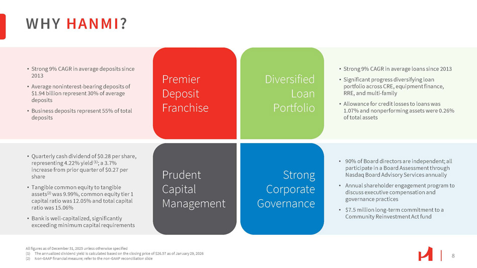 3 FORWARD - LOOKING STATEMENTS Hanmi Financial Corporation (the “Company”) cautions investors that any statements contained herein that are not historical facts are forward - looking statements within the meaning of the “safe harbor” provisions of the Private Securities Litigation Reform Act of 1995 , including, but not limited to, those statements regarding operating performance, financial position and liquidity, business strategies, regulatory, economic and competitive outlook, investment and expenditure plans, capital and financing needs and availability, litigation, plans and objectives, merger or sale activity, and all other forecasts and statements of expectation or assumption underlying any of the foregoing . These statements involve known and unknown risks and uncertainties that are difficult to predict . Investors should not rely on any forward - looking statement and should consider risks, such as changes in governmental policy, legislation and regulations, changes in monetary policy, economic uncertainty and changes in economic conditions, potential recessionary conditions, inflation, the effect of the imposition of tariffs and any retaliatory responses, the impact of a potential federal government shutdown, including our ability to effect sales of small business administration loans, fluctuations in interest rate and credit risk, competitive pressures, our ability to access cost - effective funding, the ability to enter into new markets successfully and capitalize on growth opportunities, balance sheet management, liquidity and sources of funding, the size and composition of our deposit portfolio, including the percentage of uninsured deposits in the portfolio, increased assessments by the Federal Deposit Insurance Corporation, risk and effect of natural disasters, a failure in or breach of our operational or security systems or infrastructure, including cyberattacks, the adequacy of and changes in the economic estimates and methodology of calculating our allowance for credit losses, and other operational factors . Forward - looking statements are based upon the good faith beliefs and expectations of management as of this date only and are further subject to additional risks and uncertainties, including, but not limited to, the risk factors set forth in our earnings release dated January 27 , 2026 , including the section titled “Forward Looking Statements” and the Company’s most recent Form 10 - K, 10 - Q and other filings with the Securities and Exchange Commission . The Company disclaims any obligation to update or revise the forward - looking statements herein .