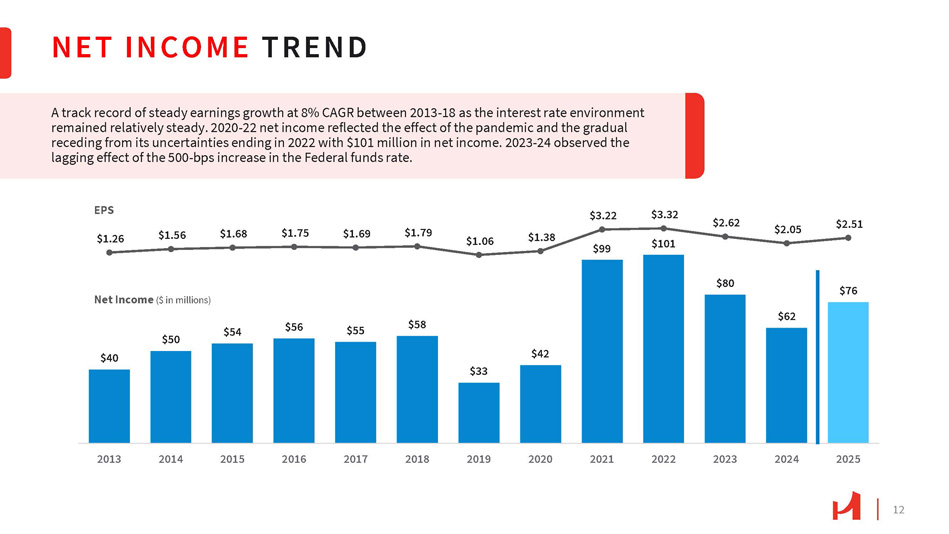$40 $50 $54 $56 $55 $58 $33 $42 $99 $101 $80 $62 $76 $1.26 $1.56 $1.68 $1.75 $1.69 $1.79 $1.06 $1.38 $3.22 $3.32 $2.62 $2.05 $2.51 2013 2014 2015 2016 2017 2018 2019 2020 2021 2022 2023 2024 2025 NET INCOME TREND 12 EPS Net Income ($ in millions) A track record of steady earnings growth at 8% CAGR between 2013 - 18 as the interest rate environment remained relatively steady. 2020 - 22 net income reflected the effect of the pandemic and the gradual receding from its uncertainties ending in 2022 with $101 million in net income. 2023 - 24 observed the lagging effect of the 500 - bps increase in the Federal funds rate.