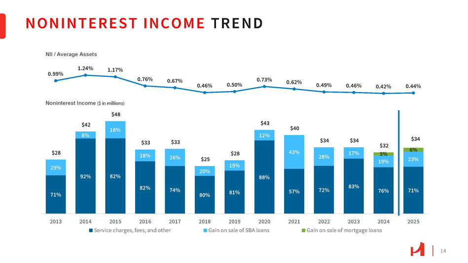 NET INTEREST INCOME & NIM TREND 13 NIM 3.94% Net Interest Income ($ in millions) $160 $148 $123 $109 $177 $181 $176 $181 $195 $238 $221 $203 $236 3.88% 3.90% 3.95% 3.82% 3.57% 3.37% 3.19% 3.08% 3.50% 3.08% 2.78% 3.15% 2013 2014 2015 2016 2017 2018 2019 2020 2021 2022 2023 2024 2025