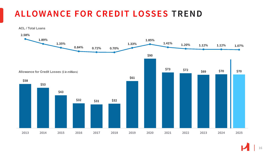 NONINTEREST EXPENSE TREND 15 NIE / Average Assets Non - Interest Expense ($ in millions) $99 $78 $115 $108 $114 $118 $126 $119 $124 $130 $137 $141 $148 2.77% 2.89% 2.83% 2.47% 2.30% 2.19% 2.30% 2.02% 1.90% 1.85% 1.84% 1.87% 1.91% 2013 2014 2015 2016 2017 2018 2019 2020 2021 2022 2023 2024 2025