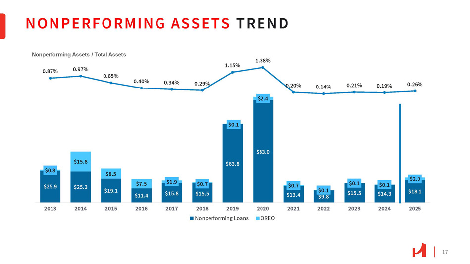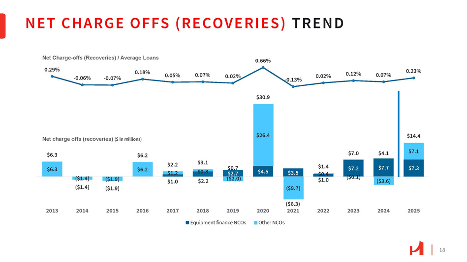 NONPERFORMING ASSETS TREND 17 NPAs/Total Assets Nonperforming Assets ($ in millions) $25.3 $19.1 $63.8 $83.0 $9.8 $15.8 $0.1 $2.4 0.87% 0.97% 0.65% 0.40% 0.34% 0.29% 1.15% 1.38% 0.20% 0.14% 0.21% 0.19% 0.26% $0.1 $0.1 $2.0 $15.5 $14.3 $18.1 $0.1 $0.7 $13.4 $0.7 $15.5 $1.9 $15.8 $7.5 $11.4 $0.8 $8.5 $25.9 2025 2024 2023 2022 2021 2020 2019 2018 2017 2016 2015 2014 2013 Nonperforming Loans OREO Nonperforming Assets / Total Assets