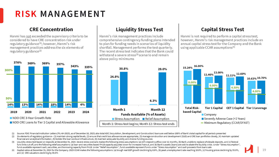 RISK MANAGEMENT 19 CRE Concentration Hanmi has not exceeded the supervisory criteria to be considered to have CRE concentration risk under regulatory guidance (1) ; however, Hanmi’s risk management practices address the six elements of regulatory guidance (2) 14% 13% 14% 18% 14% 4% 376% 369% 369% 357% 343% 335% 300% 50% 2019 2020 2021 2022 2023 2024 NOO CRE 3 - Year Growth Rate NOO CRE Loans to Tier 1 Capital and Allowable Allowance (1) Source: FDIC Financial Institution Letters (FIL - 64 - 2023), as of December 18, 2023; also total ADC (Acquisition, Development, and Construction) loans are well below 100% of Bank’s total capital for all periods presented (2) Six elements of regulatory guidance – (1) maintain strong capital levels, (2) ensure that credit loss allowances are appropriate, (3) manage construction and development (C&D) and CRE loan portfolios closely, (4) maintain updated financial and analytical information, (5) bolster the loan workout infrastructure, (6) maintain adequate liquidity and diverse funding sources (3) Liquidity stress test based on deposits at December 31, 2024. Severe stress scenario makes the following stress assumptions: (a) 22% deposit outflow over 12 months, (b) Bank unable to replace wholesale deposits, and (c) federal fund lines cut off, and the following relief assumptions: (a) loan - and - securities based FHLB capacity adjusted down for increased haircut, and (b) Bank’s assets (loans) are sold to abate the liquidity crisis. Under “Stress Assumption”, funds available represent cash, securities, and borrowing capacity from FHLB. Under “Relief Assumption”, funds available represent funds under “Stress Assumption” and cash proceeds from loans sale (4) Capital ratios at December 31, 2024 for the Company. 2025 CCAR makes the following assumptions: (a) trough real GDP growth declining by 8.9%, (b) peak unemployment rate reaching 10.0%, (c) housing prices declining by 33.0%, and (d) CRE valuations declining by 30.0% Liquidity Stress Test Hanmi’s risk management practices include comprehensive contingency funding plans intended to plan for funding needs in scenarios of liquidity shortfall. Management performs the test quarterly. The recent stress test indicates that the Bank could withstand a severe stress (3) scenario and remain above policy minimums 24.8% 6.3% 30.8% 29.0% Month 1 Month 12 Funds Available (% of Assets) Stress Assumption Relief Assumption Capital Stress Test Hanmi is not required to perform a capital stress test; however, Hanmi’s risk management practices include an annual capital stress test for the Company and the Bank using applicable CCAR assumptions (4) 15.24% 12.46% 13.00% 12.11% 12.60% 10.63% 10.70% 16.00% 8.00% 6.00% 4.50% 4.00% Total Risk - based Capital Tier 1 Capital Company CET 1 Capital Tier 1 Leverage Severely Adverse Case (+2 Years) Minimum Regulatory (CCAR/DFAST) Month 1: Stress test begins; Month 12: Stress test ends