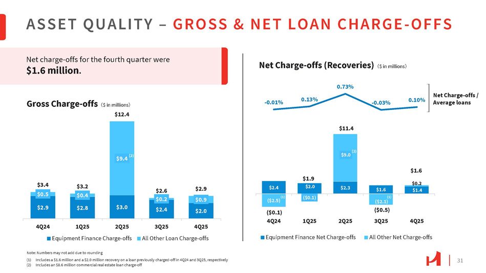 30 Nonperforming assets were $20.1 million at the end of the fourth quarter, down from $21.4 million at the end of the third quarter. $14.3 $35.6 $26.0 $19.4 $18.1 $0.1 $0.1 $2.0 $2.0 $14.4 $35.7 $26.0 $21.4 $20.1 0.19% 0.46% 0.33% 0.27% 0.26% 4Q25 3Q25 OREO ASSET QUALITY – NONPERFORMING ASSETS & NONACCRUAL LOANS (1) Nonperforming assets exclude repossessed personal property of $0.6 million, $0.7 million, $0.6 million, $0.4 million, and $0.6 million for 4Q24, 1Q25, 2Q25, 3Q25, and 4Q25, respectively (2) Specific allowance for credit losses for 4Q24, 1Q25, 2Q25, 3Q25, and 4Q25 was $6.2 million, $11.8 million, $4.1 million, $4.4 million, and $3.4 million, respectively (3) RRE includes consumer loans (4) Represents a $10.2 million CRE loan at 4Q25 4Q24 1Q25 2Q25 Nonperforming loans Note: Numbers may not add due to rounding $8.8 $8.2 $7.0 $4.5 $2.8 $4.0 $4.0 $1.7 $0.3 $6.8 $20.0 $11.0 $10.6 $35.5 (2) $19.4 2Q25 4Q25 4Q24 1Q25 Equipment Finance All other CRE and C&I < $3M $14.3 (2) $3.6 $1.9 3Q25 RRE (3) $18.1 (2) All other CRE and C&I >= $3M (2) $26.0 (2) $10.2 (4) $1.7 $1.1 $5.1 Nonperforming Assets (1) 㸦 $ in millions 㸧 Nonaccrual Loans 㸦 $ in millions 㸧 Nonperforming assets / Total assets