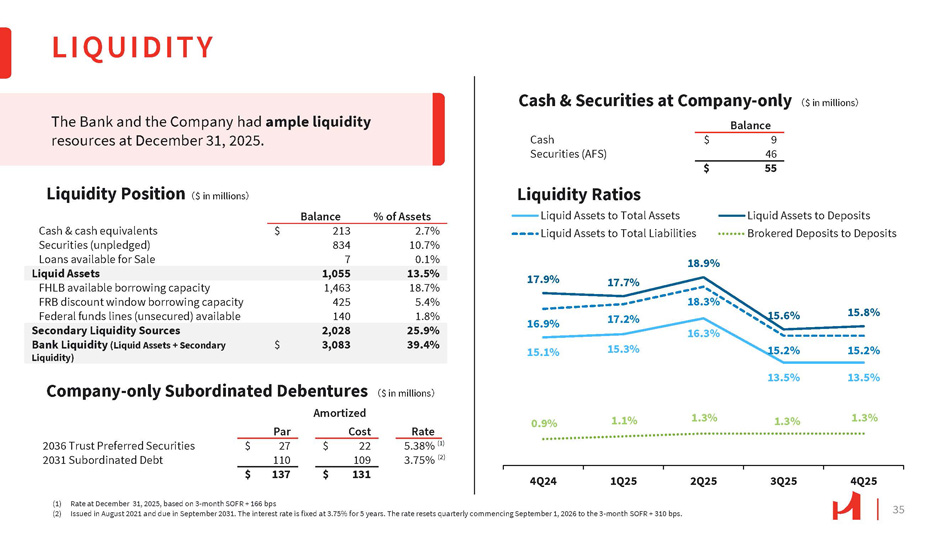 34 15 Year 66% 20 Year 19% SECURITIES PORTFOLIO $233 $294 $144 $91 $29 $24 $16 $12 $262 $318 $160 $103 2025 Actual 2026 Principal 2028 2027 Interest 2% US Agy MBS - Residential 62% US Agy MBS - Commercial 18% US Agy CMO 7% Municipa U l S Agy 11% UST 14% US Agy 7% US Agy MBS - Residential 43% US Agy MBS - Commerical 8% US Agy CMO 20% Municipal 8% Available for Sale (1) $942 Million < 1 Year 18% 1 to 3 Year 24% 3 to 5 Years 37% > 5 Years 21% $411 Million 30 Year (2) 15% Unrealized Loss $61 Million Securities Duration 3.7 Years Note: Numbers may not add due to rounding (1) Based on the book value (2) 98.0% constitutes CRA bonds The $941.8 million securities portfolio (all AFS, no HTM) represented 12% of assets at December 31, 2025, and had a weighted average modified duration of 3.7 years with $61.1 million in an unrealized loss position. Principal Paydowns 㸦 $ in millions 㸧 US Agy Residential MBS (2) (Maturity)