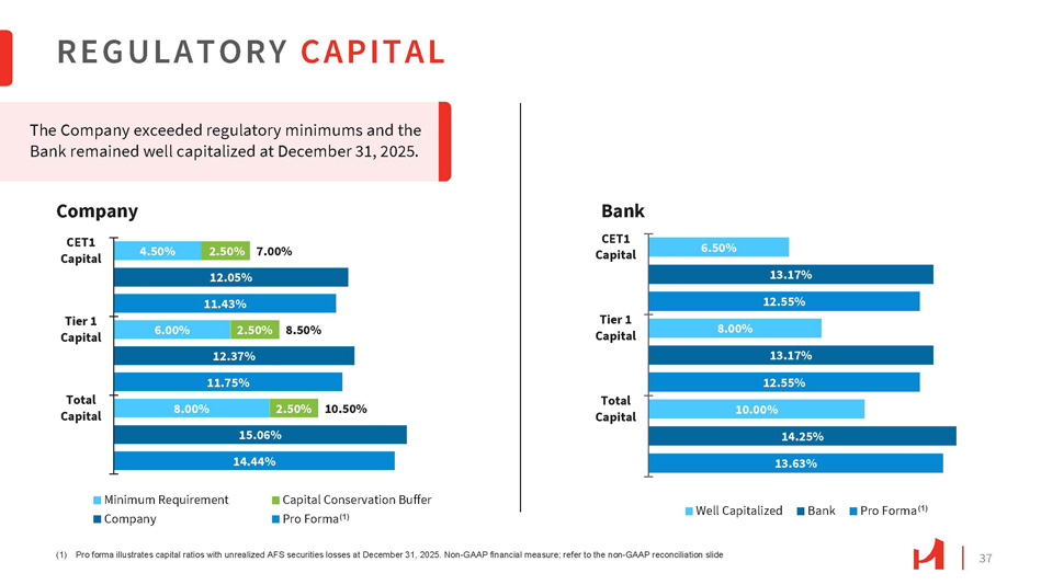 36 43% 46% 54% 37% 38% 8% 6% 21% 9% 49% 48% 35% 11% 42% 53% $17.7 $17.7 $15.1 $22.1 $21.2 9.41% 9.59% 9.58% 9.80% 9.99% 4Q24 Dividends 1Q25 2Q25 Share Repurchases 3Q25 4Q25 Net Income - Retained (2) $23.88 $24.49 $24.91 $25.64 $26.27 9.41% 9.59% 10.32% 10.37% 10.27% 9.58% 10.41% 9.80% 10.54% 9.99% 4Q24 1Q25 4Q25 (1) TCE/TA 2Q25 3Q25 TCE/TA (w/o AFS AOCI) (1) (1) Non - GAAP financial measure, refer to the non - GAAP reconciliation slides (2) “Net Income – Retained” is equal to net income minus dividend payout and share repurchases CAPITAL MANAGEMENT TCE / TA (1) Prudent capital management while driving shareholder return through stable quarterly dividends and share repurchase program. Tangible book value per share (TBVPS) (1) increased to $26.27 at the end of the fourth quarter. Contributing to the increase was a $4.8 million decrease in unrealized after - tax losses on securities available for sale, due to changes in interest rates during the fourth quarter of 2025. TBVPS (1) & TCE/TA (1) Dividends, Share Repurchases & TCE/TA (1) 㸦 $ in millions 㸧 The dividend payout ratio for 2025 was 43.0% compared with 48.8% in 2024. Share repurchases for 2025 represents 12.4% of net income; 2024 was 10.2%.