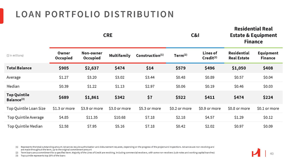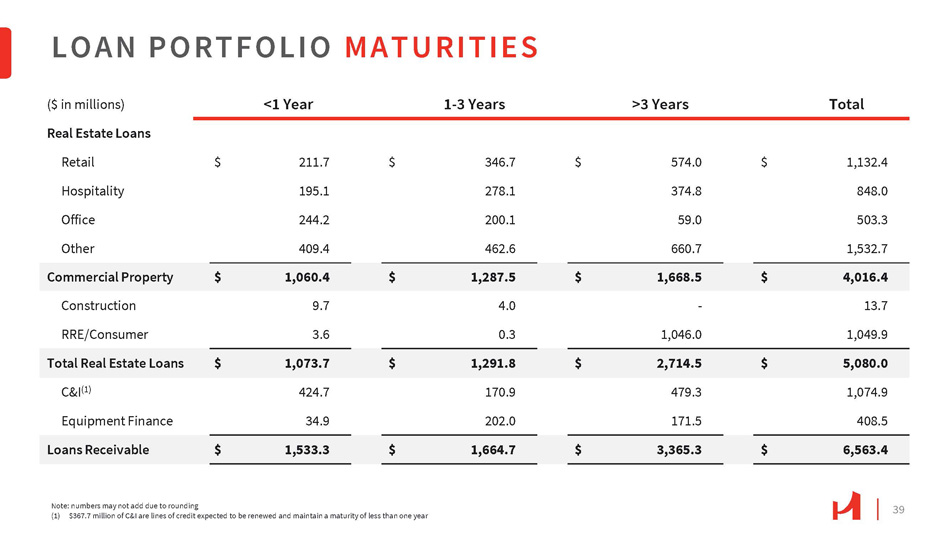 39 Total >3 Years 1 - 3 Years <1 Year ($ in millions) Real Estate Loans 1,132.4 $ 574.0 $ 346.7 $ 211.7 $ Retail 848.0 374.8 278.1 195.1 Hospitality 503.3 59.0 200.1 244.2 Office 1,532.7 660.7 462.6 409.4 Other 4,016.4 $ 1,668.5 $ 1,287.5 $ 1,060.4 $ Commercial Property 13.7 - 4.0 9.7 Construction 1,049.9 1,046.0 0.3 3.6 RRE/Consumer 5,080.0 $ 2,714.5 $ 1,291.8 $ 1,073.7 $ Total Real Estate Loans 1,074.9 479.3 170.9 424.7 C&I (1) 408.5 171.5 202.0 34.9 Equipment Finance 6,563.4 $ 3,365.3 $ 1,664.7 $ 1,533.3 $ Loans Receivable LOAN PORTFOLIO MATURITIES Note: numbers may not add due to rounding (1) $367.7 million of C&I are lines of credit expected to be renewed and maintain a maturity of less than one year