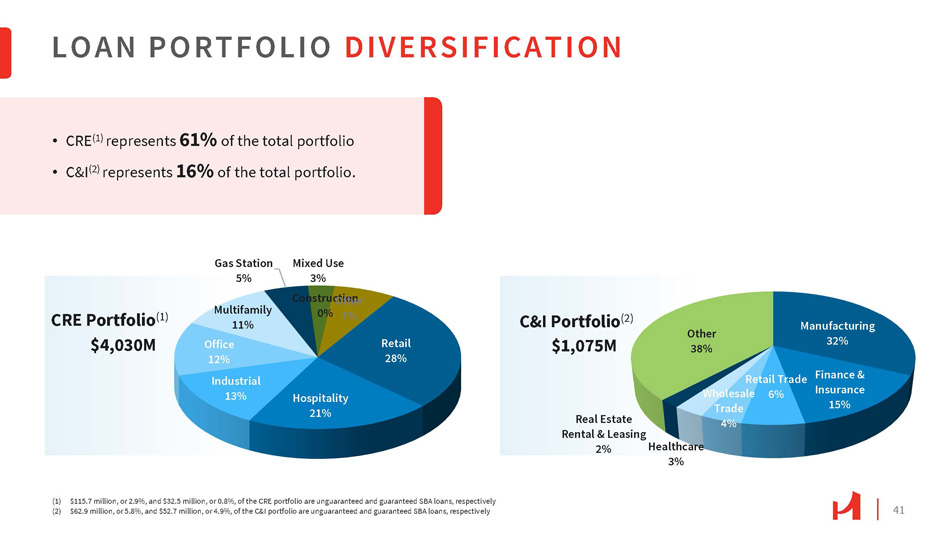 40 LOAN PORTFOLIO DISTRIBUTION Residential Real Estate & Equipment Finance C&I CRE Equipment Finance Residential Real Estate Lines of Credit (2) Term (2) Construction (1) Multifamily Non - owner Occupied Owner Occupied ($ in millions) $408 $1,050 $496 $579 $14 $474 $2,637 $905 Total Balance $0.04 $0.57 $0.89 $0.48 $3.44 $3.02 $3.20 $1.27 Average $0.03 $0.46 $0.19 $0.06 $2.97 $1.13 $1.22 $0.39 Median $224 $474 $411 $522 $7 $342 $1,861 $689 Top Quintile Balance (3) $0.1 or more $0.8 or more $0.9 or more $0.2 or more $5.3 or more $3.0 or more $3.9 or more $1.3 or more Top Quintile Loan Size $0.12 $1.29 $4.57 $2.18 $7.18 $10.68 $11.35 $4.85 Top Quintile Average $0.09 $0.97 $2.02 $0.42 $7.18 $5.16 $7.95 $2.58 Top Quintile Median (1) Represents the total outstanding amount. Advances require authorization and disbursement requests, depending on the progress of the project and inspections. Advances are non - revolving and are made throughout the term, up to the original commitment amount (2) Term loans are a commitment for a specified term. Majority of the Lines of Credit are revolving, including commercial revolvers, with some non - revolvers (sub - notes and working capital tranches) (3) Top quintile represents top 20% of the loans