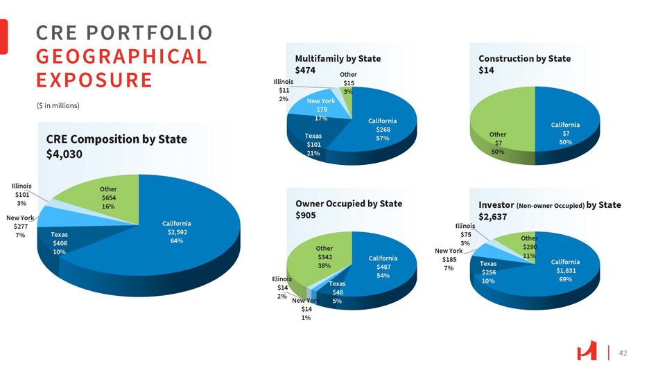 LOAN PORTFOLIO DIVERSIFICATION (1) $115.7 million, or 2.9%, and $32.5 million, or 0.8%, of the CRE portfolio are unguaranteed and guaranteed SBA loans, respectively (2) $62.9 million, or 5.8%, and $52.7 million, or 4.9%, of the C&I portfolio are unguaranteed and guaranteed SBA loans, respectively Retail 28% Hospitality 21% Industrial 13% Office 12% Multifamily 11% Gas Station 5% Mixed Use 3% Const r u c O t i t o h n er 0% 7% CRE Portfolio (1) $4,030M Manufacturing 32% Insurance 15% Retail Trade Finance & Wholesale 6% Trade 4% Healthcare 3% Real Estate Rental & Leasing 2% Other 38% C&I Portfolio (2) $1,075M • CRE (1) represents 61% of the total portfolio • C&I (2) represents 16% of the total portfolio. 41