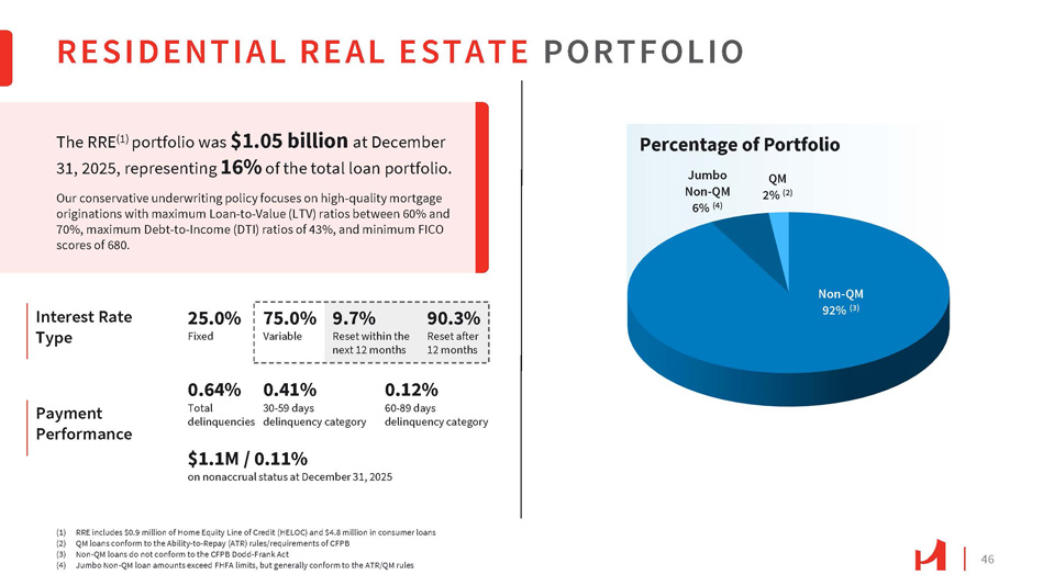 46 Payment Performance RESIDENTIAL REAL ESTATE PORTFOLIO The RRE (1) portfolio was $1.05 billion at December 31, 2025, representing 16% of the total loan portfolio. Our conservative underwriting policy focuses on high - quality mortgage originations with maximum Loan - to - Value (LTV) ratios between 60% and 70%, maximum Debt - to - Income (DTI) ratios of 43%, and minimum FICO scores of 680. 25.0% Fixed Non - QM 92% (3) Jumbo Non - QM 6% (4) QM 2% (2) (1) RRE includes $0.9 million of Home Equity Line of Credit (HELOC) and $4.8 million in consumer loans (2) QM loans conform to the Ability - to - Repay (ATR) rules/requirements of CFPB (3) Non - QM loans do not conform to the CFPB Dodd - Frank Act (4) Jumbo Non - QM loan amounts exceed FHFA limits, but generally conform to the ATR/QM rules Interest Rate Type 75.0% Variable 0.64% 0.41% Total 30 - 59 days delinquencies delinquency category 9.7% 90.3% Reset within the Reset after next 12 months 12 months 0.12% 60 - 89 days delinquency category $1.1M / 0.11% on nonaccrual status at December 31, 2025 Percentage of Portfolio