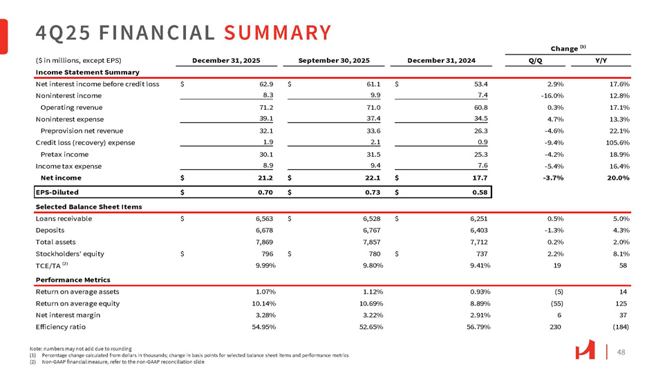 48 4 Q 25 FINANCIAL SUMMARY Note: numbers may not add due to rounding (1) Percentage change calculated from dollars in thousands; change in basis points for selected balance sheet items and performance metrics (2) Non - GAAP financial measure, refer to the non - GAAP reconciliation slide ($ in millions, except EPS) December 31, 2025 September 30, 2025 Income Statement Summary December 31, 2024 Q/Q Y/Y 17.6% 2.9% 53.4 $ 61.1 $ 62.9 $ Net interest income before credit loss 12.8% - 16.0% 7.4 9.9 8.3 Noninterest income 17.1% 0.3% 60.8 71.0 71.2 Operating revenue 13.3% 4.7% 34.5 37.4 39.1 Noninterest expense 22.1% - 4.6% 26.3 33.6 32.1 Preprovision net revenue 105.6% - 9.4% 0.9 2.1 1.9 Credit loss (recovery) expense 18.9% - 4.2% 25.3 31.5 30.1 Pretax income 16.4% - 5.4% 7.6 9.4 8.9 Income tax expense 20.0% - 3.7% 17.7 $ 22.1 $ 21.2 $ Net income 0.58 $ 0.73 $ 0.70 $ EPS - Diluted Selected Balance Sheet Items 5.0% 0.5% 6,251 $ 6,528 $ 6,563 $ Loans receivable 4.3% - 1.3% 6,403 6,767 6,678 Deposits 2.0% 0.2% 7,712 7,857 7,869 Total assets 8.1% 2.2% 737 $ 780 $ 796 $ Stockholders' equity 58 19 9.41% 9.80% 9.99% TCE/TA (2) Performance Metrics 14 (5) 0.93% 1.12% 1.07% Return on average assets 125 (55) 8.89% 10.69% 10.14% Return on average equity 37 6 2.91% 3.22% 3.28% Net interest margin (184) 230 56.79% 52.65% 54.95% Efficiency ratio Change (1)