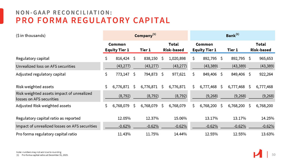 50 NON - G A A P R E C O N C I L I A T I O N : PRO FORMA REGULATORY CAPITAL Note: numbers may not add due to rounding (1) Pro forma capital ratios at December 31, 2025. Bank (1) Company (1) ($ in thousands) Total Risk - based Tier 1 Common Equity Tier 1 Total Risk - based Tier 1 Common Equity Tier 1 $ 965,653 $ 892,795 $ 892,795 $ 1,020,898 $ 838,150 $ 816,424 Regulatory capital (43,389 ) (43,389 ) (43,389 ) (43,277 ) (43,277 ) (43,277 ) Unrealized loss on AFS securities $ 922,264 $ 849,406 $ 849,406 $ 977,621 $ 794,873 $ 773,147 Adjusted regulatory capital $ 6,777,468 $ 6,777,468 $ 6,777,468 $ 6,776,871 $ 6,776,871 $ 6,776,871 Risk weighted assets $ 6,768,200 $ 6,768,200 $ 6,768,200 $ 6,768,079 $ 6,768,079 $ 6,768,079 Adjusted Risk weighted assets 14.25% 13.17% 13.17% 15.06% 12.37% 12.05% Regulatory capital ratio as reported - 0.62% - 0.62% - 0.62% - 0.62% - 0.62% - 0.62% Impact of unrealized losses on AFS securities 13.63% 12.55% 12.55% 14.44% 11.75% 11.43% Pro forma regulatory capital ratio Risk weighted assets impact of unrealized losses on AFS securities (8,792 ) (8,792 ) (8,792 ) (9,268 ) (9,268 ) (9,268 )