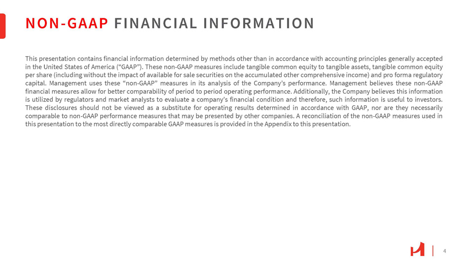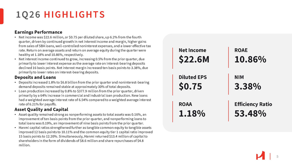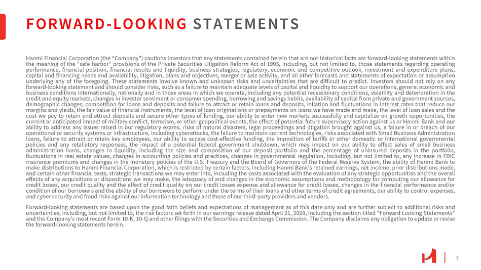 3 FORWARD - LOOKING STATEMENTS Hanmi Financial Corporation (the “Company”) cautions investors that any statements contained herein that are not historical facts are forward - looking statements within the meaning of the “safe harbor” provisions of the Private Securities Litigation Reform Act of 1995 , including, but not limited to, those statements regarding operating performance, financial position, financial results and liquidity, business strategies, regulatory, economic and competitive outlook, investment and expenditure plans, capital and financing needs and availability, litigation, plans and objectives, merger or sale activity, and all other forecasts and statements of expectation or assumption underlying any of the foregoing . These statements involve known and unknown risks and uncertainties that are difficult to predict . Investors should not rely on any forward - looking statement and should consider risks, such as a failure to maintain adequate levels of capital and liquidity to support our operations, general economic and business conditions internationally, nationally and in those areas in which we operate, including any potential recessionary conditions, volatility and deterioration in the credit and equity markets, changes in investor sentiment or consumer spending, borrowing and savings habits, availability of capital from private and government sources, demographic changes, competition for loans and deposits and failure to attract or retain loans and deposits, inflation and fluctuations in interest rates that reduce our margins and yields, the fair value of financial instruments, the level of loan originations or prepayments on loans we have made and make, the level of loan sales and the cost we pay to retain and attract deposits and secure other types of funding, our ability to enter new markets successfully and capitalize on growth opportunities, the current or anticipated impact of military conflict, terrorism, or other geopolitical events, the effect of potential future supervisory action against us or Hanmi Bank and our ability to address any issues raised in our regulatory exams, risks of natural disasters, legal proceedings and litigation brought against us, a failure in or breach of our operational or security systems or infrastructure, including cyberattacks, the failure to maintain current technologies, risks associated with Small Business Administration loans, failure to attract or retain key employees, our ability to access cost - effective funding, the imposition of tariffs or other domestic or international governmental policies and any retaliatory responses, the impact of a potential federal government shutdown, which may impact on our ability to effect sales of small business administration loans, changes in liquidity, including the size and composition of our deposit portfolio and the percentage of uninsured deposits in the portfolio, fluctuations in real estate values, changes in accounting policies and practices, changes in governmental regulation, including, but not limited to, any increase in FDIC insurance premiums and changes in the monetary policies of the U . S . Treasury and the Board of Governors of the Federal Reserve System, the ability of Hanmi Bank to make distributions to Hanmi Financial Corporation, which is restricted by certain factors, including Hanmi Bank’s retained earnings, net income, prior distributions made, and certain other financial tests, strategic transactions we may enter into, including the costs associated with the evaluation of any strategic opportunities and the overall effects of any acquisitions or dispositions we may make, the adequacy of and changes in the economic assumptions and methodology for computing our allowance for credit losses, our credit quality and the effect of credit quality on our credit losses expense and allowance for credit losses, changes in the financial performance and/or condition of our borrowers and the ability of our borrowers to perform under the terms of their loans and other terms of credit agreements, our ability to control expenses, and cyber security and fraud risks against our information technology and those of our third - party providers and vendors . Forward - looking statements are based upon the good faith beliefs and expectations of management as of this date only and are further subject to additional risks and uncertainties, including, but not limited to, the risk factors set forth in our earnings release dated April 21 , 2026 , including the section titled “Forward Looking Statements” and the Company’s most recent Form 10 - K, 10 - Q and other filings with the Securities and Exchange Commission . The Company disclaims any obligation to update or revise the forward - looking statements herein .