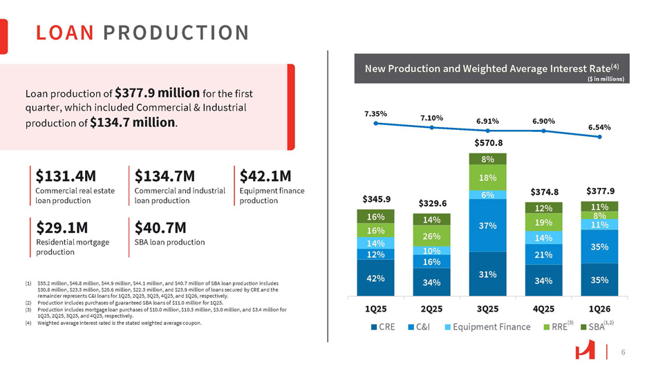 5 Net Income $22.6M Diluted EPS $0.75 ROAA 1.18% ROAE 10.86% NIM 3.38% Efficiency Ratio 53.48% Earnings Performance • Net income was $22.6 million, or $0.75 per diluted share, up 6.2% from the fourth quarter, driven by continued growth in net interest income and margin, higher gains from sales of SBA loans, well - controlled noninterest expenses, and a lower effective tax rate. Return on average assets and return on average equity during the quarter were healthy at 1.18% and 10.86%, respectively. • Net interest income continued to grow, increasing 0.5% from the prior quarter, due primarily to lower interest expense as the average rate on interest - bearing deposits declined 16 basis points. Net interest margin increased ten basis points to 3.38%, due primarily to lower rates on interest - bearing deposits. Deposits and Loans • Deposits increased 1.8% to $6.8 billion from the prior quarter and noninterest - bearing demand deposits remained stable at approximately 30% of total deposits. • Loan production increased by 0.8% to $377.9 million from the prior quarter, driven primarily by a 64% increase in commercial and industrial loan production. New loans had a weighted average interest rate of 6.54% compared to a weighted average interest rate of 6.21% for payoffs. Asset Quality and Capital • Asset quality remained strong as nonperforming assets to total assets was 0 . 16 % , an improvement of ten basis points from the prior quarter, and nonperforming loans to total loans was 0 . 19 % , an improvement of nine basis points from the prior quarter . • Hanmi capital ratios strengthened further as tangible common equity to tangible assets improved 12 basis points to 10.11% and the common equity tier 1 capital ratio improved 15 basis points to 12.20%. Simultaneously, Hanmi returned $13.4 million of capital to shareholders in the form of dividends of $8.6 million and share repurchases of $4.8 million. 1Q26 HIGHLIGHTS