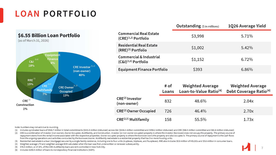 LOAN PRODUCTION 6 Loan production of $377.9 million for the first quarter, which included Commercial & Industrial production of $134.7 million . (1) $55.2 million, $46.8 million, $44.9 million, $44.1 million, and $40.7 million of SBA loan production includes $30.8 million, $23.3 million, $20.6 million, $22.3 million, and $23.9 million of loans secured by CRE and the remainder represents C&I loans for 1Q25, 2Q25, 3Q25, 4Q25, and 1Q26, respectively. (2) Production includes purchases of guaranteed SBA loans of $11.0 million for 1Q25. (3) Production includes mortgage loan purchases of $10.0 million, $10.3 million, $3.0 million, and $3.4 million for 1Q25, 2Q25, 3Q25, and 4Q25, respectively. (4) Weighted average interest rated is the stated weighted average coupon. $131.4M Commercial real estate loan production $134.7M Commercial and industrial loan production $42.1M Equipment finance production $29.1M Residential mortgage production $40.7M SBA loan production 42% 31% 34% 35% 37% 6% $345.9 16% 16% 14% 12% $329.6 14% 26% 10% 16% 34% $570.8 8% 18% $374.8 12% 19% 14% 21% $377.9 11% 8% 11% 35% 7.35% 7.10% 6.91% 6.90% 6.54% 1Q26 SBA (1,2) 1Q25 CRE 2Q25 C&I 3Q25 Equipment Finance 4Q25 RRE (3) New Production and Weighted Average Interest Rate (4) ($ in millions)