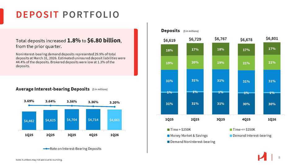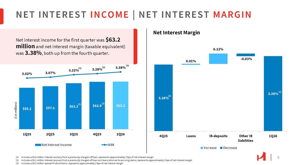 31% 31% 31% 31% 31% 17% 17% 18% 17% 18% 21% 21% 19% 20% 19% $6,729 $6,767 $6,678 1% 1% 1% 1% 1% 30% 30% 31% 31% 31% 1Q26 4Q25 3Q25 2Q25 1Q25 Deposits $6,619 $6,801 Time > $250K Money Market & Savings Demand Noninterest - bearing Time <= $250K Demand Interest - bearing $4,661 $4,714 $4,704 $4,625 $4,462 1Q26 4Q25 3Q25 2Q25 1Q25 3.69% 3.64% 3.56% 3.36% 3.20% Rate on Interest - Bearing Deposits Average Interest - bearing Deposits DEPOSIT PORTFOLIO Total deposits increased 1.8% to $6.80 billion , from the prior quarter. Noninterest - bearing demand deposits represented 29.9% of total deposits at March 31, 2026. Estimated uninsured deposit liabilities were 44.4% of the deposits. Brokered deposits were low at 1.3% of the deposits. Note: Numbers may not add due to rounding. 8 ($ in millions) ($ in millions)