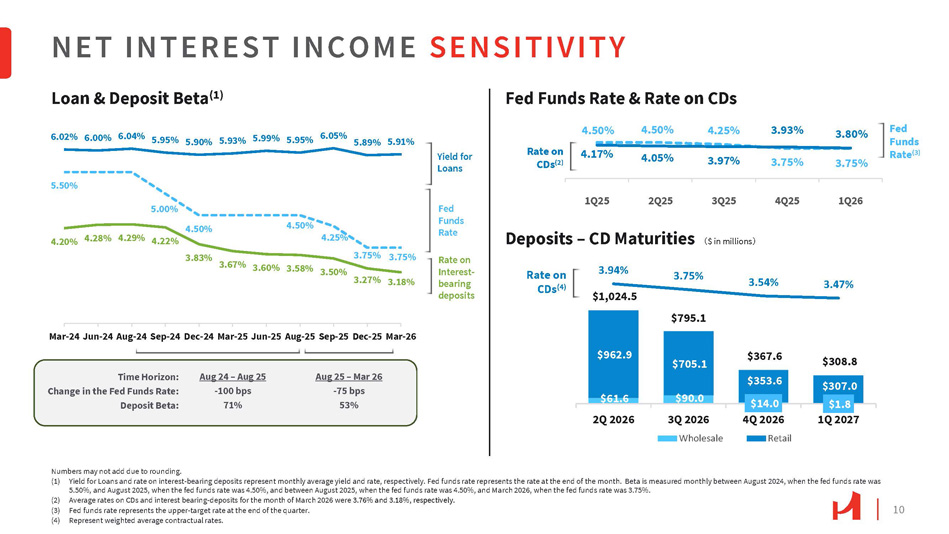 10 6.02% 6.00% 6.04% 5.95% 5.90% 5.93% 5.99% 5.95% 6.05% 5.89% 5.91% 4.20% 4.28% 4.29% 4.22% 3.83% 3.67% 3.18% 5.50% 5.00% 4.50% 4.50% 4.25% 3.75% 3.60% 3.58% 3.50% 3.27% 3.75% Mar - 24 Jun - 24 Aug - 24 Sep - 24 Dec - 24 Mar - 25 Jun - 25 Aug - 25 Sep - 25 Dec - 25 Mar - 26 NET INTEREST INCOME SENSITIVITY $61.6 $90.0 $14.0 $1.8 $962.9 $705.1 $1,024.5 $795.1 $367.6 $353.6 $308.8 $307.0 3.94% 3.54% 3.47% Rate on 3.75% CDs (4) 2Q 2026 1Q 2027 3Q 2026 Wholesale 4Q 2026 Retail 4.50% 4.50% 4.25% 3.75% 3.75% 4.17% 4.05% 3.97% 3.93% 3.80% 1Q25 2Q25 3Q25 Deposits – CD Maturities 㸦 $ in millions 㸧 4Q25 1Q26 Fed Funds Rate (3) Numbers may not add due to rounding. (1) Yield for Loans and rate on interest - bearing deposits represent monthly average yield and rate, respectively. Fed funds rate represents the rate at the end of the month. Beta is measured monthly between August 2024, when the fed funds rate was 5.50%, and August 2025, when the fed funds rate was 4.50%, and between August 2025, when the fed funds rate was 4.50%, and March 2026, when the fed funds rate was 3.75%. (2) Average rates on CDs and interest bearing - deposits for the month of March 2026 were 3.76% and 3.18%, respectively. (3) Fed funds rate represents the upper - target rate at the end of the quarter. (4) Represent weighted average contractual rates. Fed Funds Rate Yield for Loans Rate on Interest - bearing deposits Loan & Deposit Beta (1) Fed Funds Rate & Rate on CDs Rate on CDs (2) Time Horizon: Change in the Fed Funds Rate: Deposit Beta: Aug 24 – Aug 25 - 100 bps 71% Aug 25 – Mar 26 - 75 bps 53%