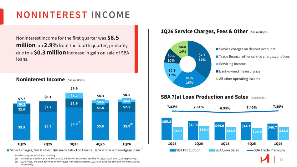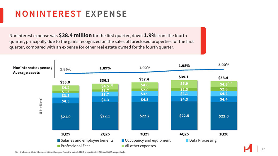 11 $2.1 36% $1.5 25% $0.9 15% $0.6 10% $0.8 14% Service charges on deposit accounts Trade finance, other service charges, and fees Servicing income Bank - owned life insurance All other operating income NONINTEREST INCOME $55.2 $46.8 $44.9 $44.1 $40.7 $32.2 $35.4 $32.6 $29.9 $32.5 7.82% 7.61% 6.95% 7.40% 7.88% 1Q25 2Q25 3Q25 SBA Loan Sales SBA Production 4Q25 1Q26 SBA Trade Premium $5.5 $6.8 $5.9 $2.0 $2.2 $1.9 $1.8 $2.1 $0.2 $1.2 $0.6 $0.5 $7.7 $8.1 Noninterest Income 㸦 $ in millions 㸧 $9.9 $8.3 $8.5 1Q25 2Q25 Service charges, fees & other 3Q25 Gain on sale of SBA loans (1) $5.9 Numbers may not add due to rounding. (1) Includes $0.4 million, $0.9 million, and $0.3 million in BOLI death benefits for 2Q25, 3Q25, and 1Q26, respectively. (2) 1Q25, 4Q25, and 1Q26 each had one mortgage loan sale transaction. 2Q25 and 3Q25 had zero and two transactions, respectively. Noninterest income for the first quarter was $8.5 million , up 2.9% from the fourth quarter, primarily due to a $0.3 million increase in gain on sale of SBA loans. 1Q26 Service Charges, Fees & Other 㸦 $ in millions 㸧 SBA 7(a) Loan Production and Sales 㸦 $ in million 㸧 (1) 4Q25 1Q26 Gain of sale of mortgage loans (2) $5.9 (1)