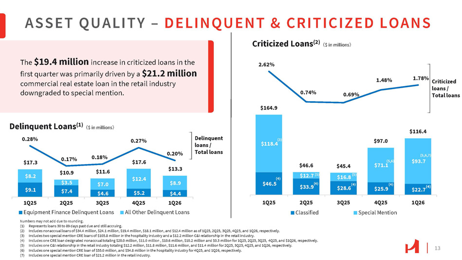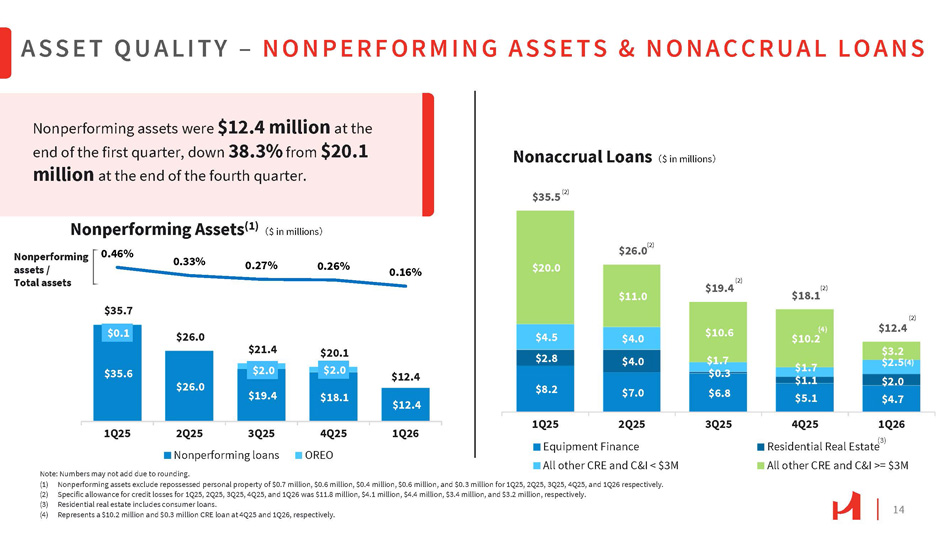 13 $9.1 $5.2 $8.2 $12.4 $8.9 $4.4 $17.3 $10.9 $3.5 $7.4 $11.6 $7.0 $4.6 $17.6 $13.3 Delinquent Loans (1) 㸦 $ in millions 㸧 0.28% 0.17% 0.18% 0.27% 0.20% 4Q25 1Q26 All Other Delinquent Loans 1Q25 2Q25 3Q25 Equipment Finance Delinquent Loans Numbers may not add due to rounding. ASSET QUALITY – DELINQUENT & CRITICIZED LOANS Delinquent loans / Total loans $22.7 $118.4 $71.1 $164.9 $46.6 $97.0 $116.4 2.62% 0.74% 0.69% 1.48% 1.78% Criticized loans / Total loans 1Q25 2Q25 Classified 3Q25 4Q25 Special Mention 1Q26 (1) Represents loans 30 to 89 days past due and still accruing. (2) Includes nonaccrual loans of $34.4 million, $24.1 million, $19.4 million, $18.1 million, and $12.4 million as of 1Q25, 2Q25, 3Q25, 4Q25, and 1Q26, respectively. (3) Includes two special mention CRE loans of $105.8 million in the hospitality industry and a $12.2 million C&I relationship in the retail industry. (4) Includes one CRE loan designated nonaccrual totaling $20.0 million, $11.0 million , $10.6 million, $10.2 million and $0.3 million for 1Q25, 2Q25, 3Q25, 4Q25, and $1Q26, respectively. (5) Includes one C&I relationship in the retail industry totaling $12.2 million, $11.8 million, $11.6 million, and $11.4 million for 2Q25, 3Q25, 4Q25, and 1Q26, respectively. (6) Includes one special mention CRE loan of $55.0 million, and $54.8 million in the hospitality industry for 4Q25, and 1Q26, respectively. (7) Includes one special mention CRE loan of $21.2 million in the retail industry. (3) (4) $46.5 $12.7 (5) $33.9 (4) $45.4 $16.8 (5) (4) $28.6 The $19.4 million increase in criticized loans in the first quarter was primarily driven by a $21.2 million commercial real estate loan in the retail industry downgraded to special mention. Criticized Loans (2) 㸦 $ in millions 㸧 (5,6) (4) $25.9 (5,6,7) $93.7
