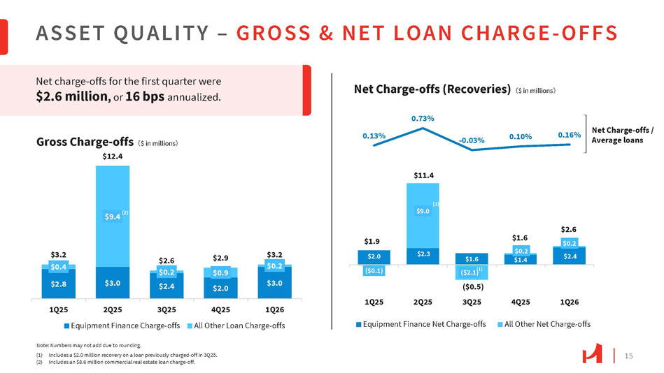14 Nonperforming assets were $ 12 . 4 million at the end of the first quarter, down 38 . 3 % from $ 20 . 1 million at the end of the fourth quarter . $35.6 $26.0 $19.4 $18.1 $12.4 $0.1 $2.0 $2.0 $35.7 $26.0 $21.4 $20.1 $12.4 0.46% 0.33% 0.27% 0.26% 0.16% 1Q26 4Q25 OREO ASSET QUALITY – NONPERFORMING ASSETS & NONACCRUAL LOANS (1) Nonperforming assets exclude repossessed personal property of $0.7 million, $0.6 million, $0.4 million, $0.6 million, and $0.3 million for 1Q25, 2Q25, 3Q25, 4Q25, and 1Q26 respectively. (2) Specific allowance for credit losses for 1Q25, 2Q25, 3Q25, 4Q25, and 1Q26 was $11.8 million, $4.1 million, $4.4 million, $3.4 million, and $3.2 million, respectively. (3) Residential real estate includes consumer loans. (4) Represents a $10.2 million and $0.3 million CRE loan at 4Q25 and 1Q26, respectively. 1Q25 2Q25 3Q25 Nonperforming loans Note: Numbers may not add due to rounding. $20.0 $11.0 $10.2 $35.5 (2) $18.1 3Q25 1Q25 2Q25 Equipment Finance All other CRE and C&I < $3M 4Q25 1Q26 Residential Real Estate (3) All other CRE and C&I >= $3M $26.0 (2) (2) (2) (2) $19.4 $12.4 (4) $10.6 $4.0 $4.5 $3.2 $2.5 $2.0 $4.7 $1.7 $1.1 $5.1 $1.7 $0.3 $6.8 $4.0 $7.0 $2.8 $8.2 Nonperforming Assets (1) 㸦 $ in millions 㸧 Nonaccrual Loans 㸦 $ in millions 㸧 Nonperforming assets / Total assets