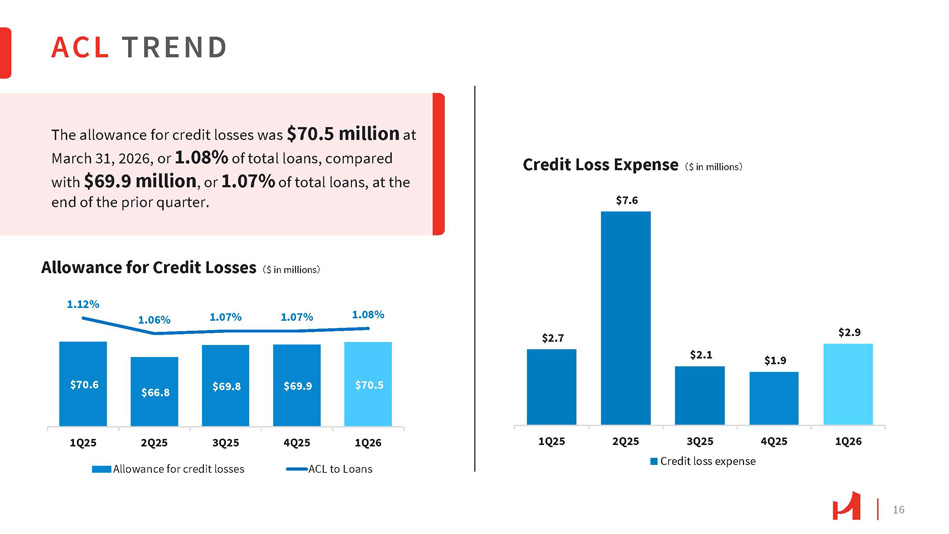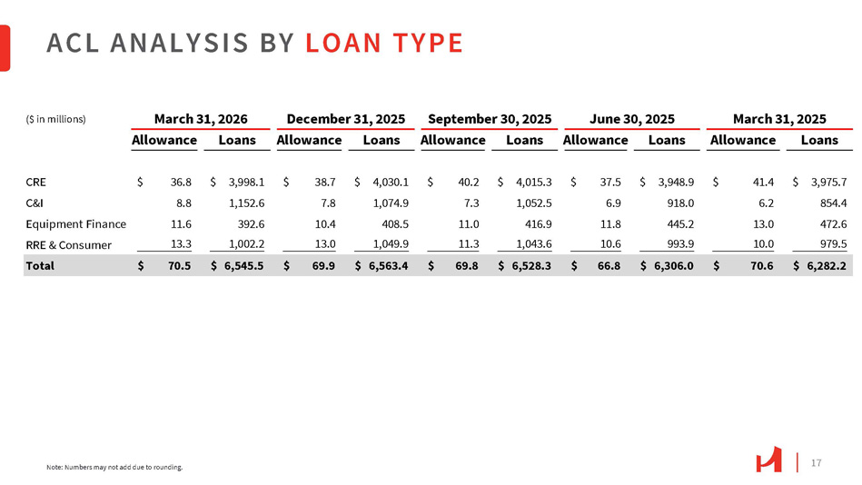 16 $70.6 $66.8 $69.8 $69.9 $70.5 1.06% 1.07% 1.07% 1.08% Allowance for Credit Losses 㸦 $ in millions 㸧 1.12% 1Q25 2Q25 3Q25 Allowance for credit losses 4Q25 1Q26 ACL to Loans $2.7 Credit Loss Expense 㸦 $ in millions 㸧 $7.6 $2.1 $1.9 $2.9 1Q25 2Q25 3Q25 Credit loss expense 4Q25 1Q26 The allowance for credit losses was $70.5 million at March 31, 2026, or 1.08% of total loans, compared with $69.9 million , or 1.07% of total loans, at the end of the prior quarter. ACL TREND
