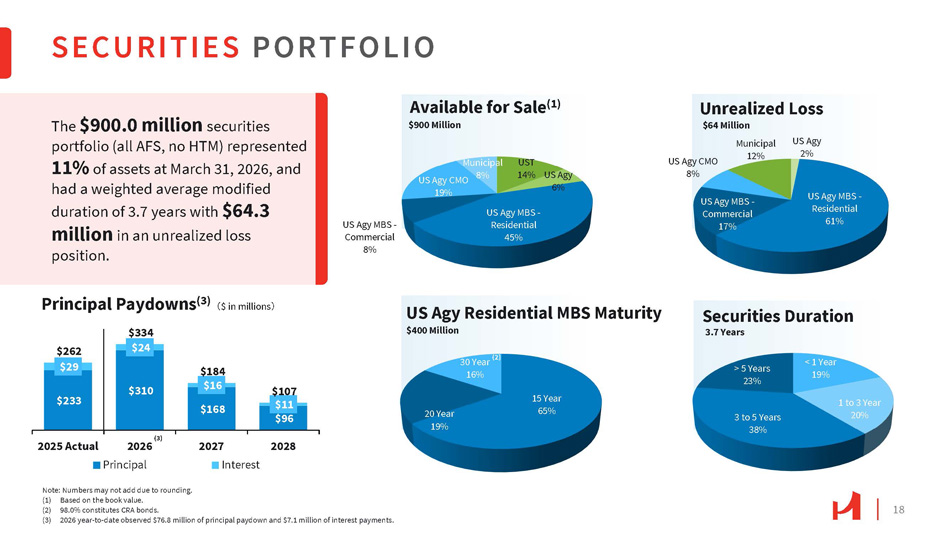 18 15 Year 65% 20 Year 19% SECURITIES PORTFOLIO $233 $310 $168 $96 $29 $24 $16 $11 $262 $334 $184 $107 2025 Actual 2026 Principal 2028 2027 Interest US Agy 2% US Agy MBS - Residential 61% US Agy MBS - Commercial 17% US Agy CMO 8% Municipal 12% UST 14% US Agy 6% US Agy MBS - Residential 45% US Agy MBS - Commercial 8% US Agy CMO 19% Municipal 8% Available for Sale (1) $900 Million < 1 Year 19% 1 to 3 Year 20% 3 to 5 Years 38% > 5 Years 23% $400 Million 30 Year (2) 16% Unrealized Loss $64 Million Securities Duration 3.7 Years Note: Numbers may not add due to rounding. (1) Based on the book value. (2) 98.0% constitutes CRA bonds. (3) 2026 year - to - date observed $76.8 million of principal paydown and $7.1 million of interest payments. The $900.0 million securities portfolio (all AFS, no HTM) represented 11% of assets at March 31, 2026, and had a weighted average modified duration of 3.7 years with $64.3 million in an unrealized loss position. Principal Paydowns (3) 㸦 $ in millions 㸧 US Agy Residential MBS Maturity (3)