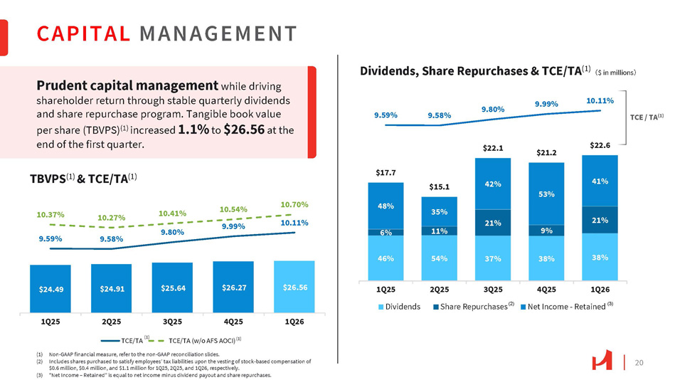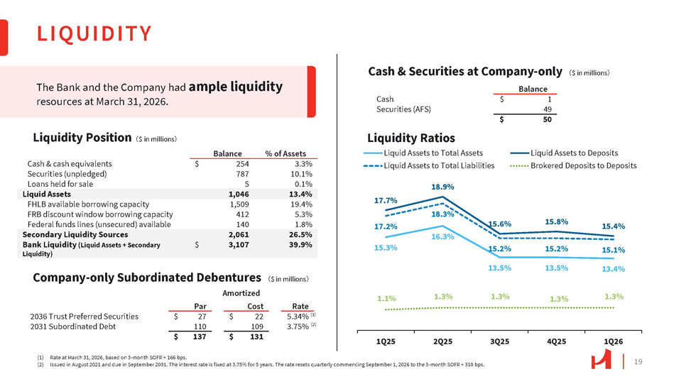 19 LIQUIDITY 1Q25 2Q25 (1) Rate at March 31, 2026, based on 3 - month SOFR + 166 bps. (2) Issued in August 2021 and due in September 2031. The interest rate is fixed at 3.75% for 5 years. The rate resets quarterly commencing September 1, 2026 to the 3 - month SOFR + 310 bps. 15.3% 16.3% 15.6% 15.8% 15.4% 17.2% 18.9% 17.7% 18.3% 15.2% 13.5% 15.2% 13.5% 15.1% 13.4% 1.1% 1.3% 1.3% 1.3% 1.3% 3Q25 4Q25 1Q26 Liquid Assets to Total Assets Liquid Assets to Total Liabilities Liquid Assets to Deposits Brokered Deposits to Deposits Liquidity Position 㸦 $ in millions 㸧 Cash & Securities at Company - only 㸦 $ in millions 㸧 Company - only Subordinated Debentures 㸦 $ in millions 㸧 Liquidity Ratios % of Assets Balance 3.3% 254 $ Cash & cash equivalents 10.1% 787 Securities (unpledged) 0.1% 5 Loans held for sale 13.4% 1,046 Liquid Assets 19.4% 1,509 FHLB available borrowing capacity 5.3% 412 FRB discount window borrowing capacity 1.8% 140 Federal funds lines (unsecured) available 26.5% 2,061 Secondary Liquidity Sources 39.9% 3,107 $ Bank Liquidity (Liquid Assets + Secondary Liquidity) Balance 1 $ Cash 49 Securities (AFS) 50 $ Amortized Rate Cost Par 5.34% 22 $ 27 $ 2036 Trust Preferred Securities 3.75% 109 110 2031 Subordinated Debt 131 $ 137 $ The Bank and the Company had ample liquidity resources at March 31, 2026. (1) (2)