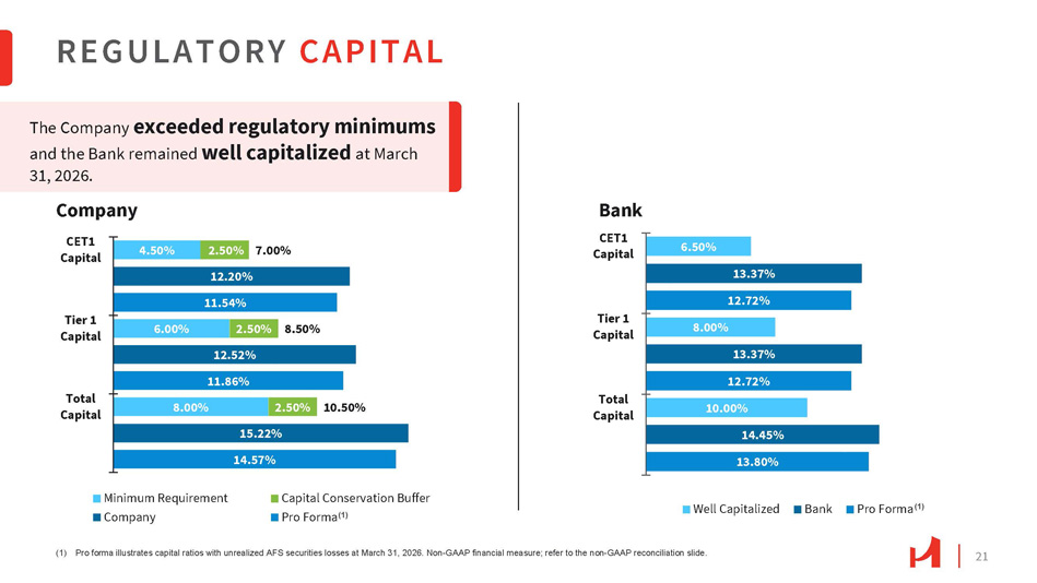 20 42% 53% 41% $17.7 $15.1 $22.1 $21.2 $22.6 9.59% 9.58% 9.80% 9.99% 10.11% 1Q25 Dividends $24.49 $24.91 $25.64 $26.27 $26.56 9.59% 9.58% 10.37% 10.27% 21% 21% 9% 35% 11% 48% 6% 10.41% 10.54% 10.70% 9.80% 9.99% 10.11% 38% 38% 37% 54% 46% 1Q25 2Q25 1Q26 TCE/TA (1) 3Q25 4Q25 TCE/TA (w/o AFS AOCI) (1) 4Q25 1Q26 Net Income - Retained (3) (1) Non - GAAP financial measure, refer to the non - GAAP reconciliation slides. (2) Includes shares purchased to satisfy employees’ tax liabilities upon the vesting of stock - based compensation of $0.6 million, $0.4 million, and $1.1 million for 1Q25, 2Q25, and 1Q26, respectively. (3) “Net Income – Retained” is equal to net income minus dividend payout and share repurchases. CAPITAL MANAGEMENT TCE / TA (1) Prudent capital management while driving shareholder return through stable quarterly dividends and share repurchase program. Tangible book value per share (TBVPS) (1) increased 1.1% to $26.56 at the end of the first quarter. TBVPS (1) & TCE/TA (1) Dividends, Share Repurchases & TCE/TA (1) 㸦 $ in millions 㸧 2Q25 3Q25 Share Repurchases (2)