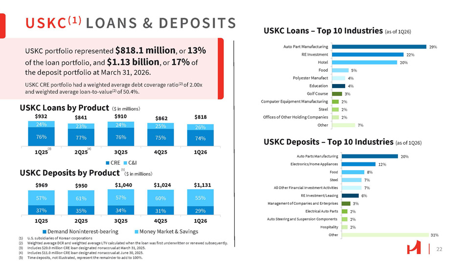22 USKC ( 1 ) LOANS & DEPOSITS USKC portfolio represented $818.1 million , or 13% of the loan portfolio, and $1.13 billion , or 17% of the deposit portfolio at March 31, 2026. USKC CRE portfolio had a weighted average debt coverage ratio (2) of 2.00x and weighted average loan - to - value (2) of 50.4%. USKC Loans – Top 10 Industries (as of 1Q26) 29% 22% 20% 5% 4% 4% 3% 2% 2% 2% 7% Auto Part Manufacturing RE Investment Hotel Food Polyester Manufact Education Golf Course Computer Equipment Manufacturing Steel Offices of Other Holding Companies Other 20% 12% 8% 7% Steel 7% All Other Financial Investment Activities 6% RE Investment/Leasing 3% Management of Companies and Enterprises 2% Electrical Auto Parts 2% Auto Steering and Suspension Components 2% Hospitality Other 31% Auto Parts Manufacturing Electronics/Home Appliances Food USKC Deposits – Top 10 Industries (as of 1Q26) $932 24% 76% $841 23% 77% $910 24% 76% $862 25% 75% $818 26% 74% 4Q25 1Q26 3Q25 CRE C&I USKC Loans by Product 㸦 $ in millions 㸧 (3) 1Q25 2Q25 (4) USKC Deposits by Product 㸦 $ in millions 㸧 $1,131 $1,024 $1,040 $950 $969 55% 60% 57% 61% 57% 29% 31% 34% 35% 37% 1Q26 4Q25 3Q25 2Q25 1Q25 Demand Noninterest - bearing Money Market & Savings (1) U.S. subsidiaries of Korean corporations (2) Weighted average DCR and weighted average LTV calculated when the loan was first underwritten or renewed subsequently. (3) Includes $20.0 million CRE loan designated nonaccrual at March 31, 2025. (4) Includes $11.0 million CRE loan designated nonaccrual at June 30, 2025. (5) Time deposits, not illustrated, represent the remainder to add to 100%. (5)