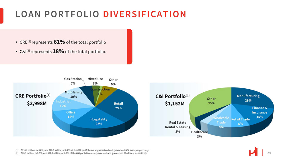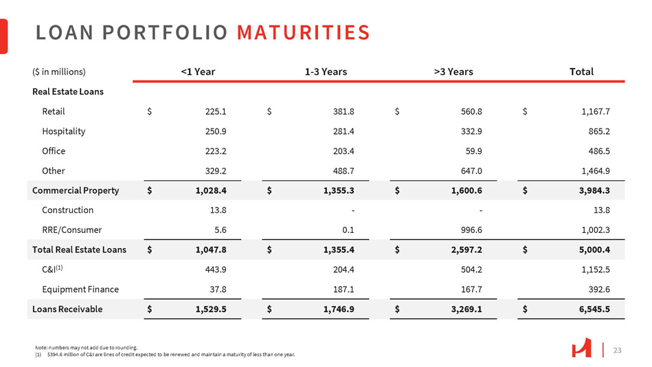 23 Total >3 Years 1 - 3 Years <1 Year ($ in millions) Real Estate Loans 1,167.7 $ 560.8 $ 381.8 $ 225.1 $ Retail 865.2 332.9 281.4 250.9 Hospitality 486.5 59.9 203.4 223.2 Office 1,464.9 647.0 488.7 329.2 Other 3,984.3 $ 1,600.6 $ 1,355.3 $ 1,028.4 $ Commercial Property 13.8 - - 13.8 Construction 1,002.3 996.6 0.1 5.6 RRE/Consumer 5,000.4 $ 2,597.2 $ 1,355.4 $ 1,047.8 $ Total Real Estate Loans 1,152.5 504.2 204.4 443.9 C&I (1) 392.6 167.7 187.1 37.8 Equipment Finance 6,545.5 $ 3,269.1 $ 1,746.9 $ 1,529.5 $ Loans Receivable LOAN PORTFOLIO MATURITIES Note: numbers may not add due to rounding. (1) $394.6 million of C&I are lines of credit expected to be renewed and maintain a maturity of less than one year.