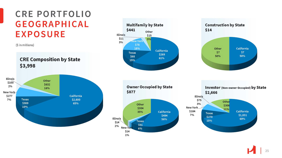 LOAN PORTFOLIO DIVERSIFICATION (1) $118.2 million, or 3.0%, and $28.8 million, or 0.7%, of the CRE portfolio are unguaranteed and guaranteed SBA loans, respectively. (2) $63.3 million, or 5.5%, and $51.5 million, or 4.5%, of the C&I portfolio are unguaranteed and guaranteed SBA loans, respectively. Retail 29% Hospitality 22% Office 12% Industrial 12% Multifamily 10% Gas Station 5% Mixed Use 3% Construction 1% Other 6% CRE Portfolio (1) $3,998M Manufacturing 29% Finance & Insurance 15% 6% Wholesale Retail Trade Trade 8% Healthcare 3% Real Estate Rental & Leasing 3% Other 36% C&I Portfolio (2) $1,152M • CRE (1) represents 61% of the total portfolio • C&I (2) represents 18% of the total portfolio. 24