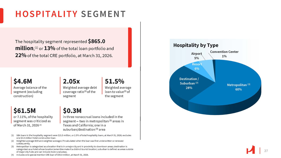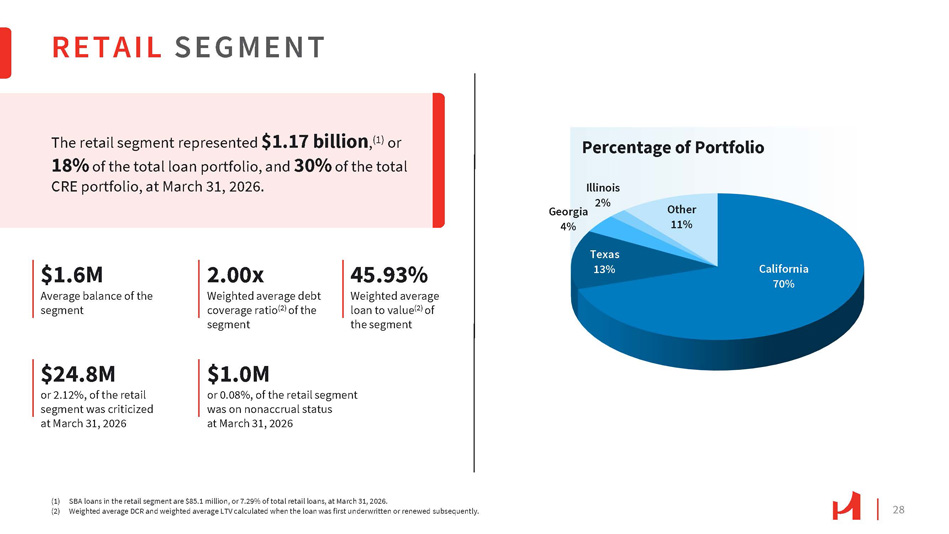 27 HOSPITALITY SEGMENT (1) SBA loans in the hospitality segment were $21.5 million, or 2.5% of total hospitality loans, at March 31, 2026; excludes one $4.0 million hotel construction loan. (2) Weighted average DCR and weighted average LTV calculated when the loan was first underwritten or renewed subsequently. (3) Metropolitan is categorized as a location that is in a major city and in proximity to downtown areas; destination is categorized as a hotel whose location/amenities make it a distinct tourist location; suburban is defined as areas outside of major city hubs and can include more rural areas. (4) Includes one special mention CRE loan of $55.0 million, at March 31, 2026. The hospitality segment represented $865.0 million , (1) or 13% of the total loan portfolio and 22% of the total CRE portfolio, at March 31, 2026. $4.6M Average balance of the segment (excluding construction) 2.05x Weighted average debt coverage ratio (2) of the segment 51.5% Weighted average loan to value (2) of the segment $61.5M or 7.11%, of the hospitality segment was criticized as of March 31, 2026 (4) $0.3M in three nonaccrual loans included in the segment – two in metropolitan (3) areas in Texas and California; one in a suburban/destination (3) area Metropolitan (3) 60% Destination / Suburban (3) 28% Airport 5% Resort 6% Convention Center 1% Hospitality by Type