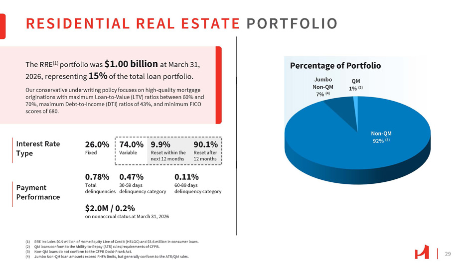 29 Payment Performance RESIDENTIAL REAL ESTATE PORTFOLIO The RRE (1) portfolio was $1.00 billion at March 31, 2026, representing 15% of the total loan portfolio. Our conservative underwriting policy focuses on high - quality mortgage originations with maximum Loan - to - Value (LTV) ratios between 60% and 70%, maximum Debt - to - Income (DTI) ratios of 43%, and minimum FICO scores of 680. 26.0% Fixed Non - QM 92% (3) Jumbo Non - QM 7% (4) QM 1% (2) (1) RRE includes $0.9 million of Home Equity Line of Credit (HELOC) and $5.6 million in consumer loans. (2) QM loans conform to the Ability - to - Repay (ATR) rules/requirements of CFPB. (3) Non - QM loans do not conform to the CFPB Dodd - Frank Act. (4) Jumbo Non - QM loan amounts exceed FHFA limits, but generally conform to the ATR/QM rules. Interest Rate Type 74.0% Variable 0.78% 0.47% 9.9% 90.1% Reset within the Reset after next 12 months 12 months 0.11% Total 30 - 59 days 60 - 89 days delinquencies delinquency category delinquency category $2.0M / 0.2% on nonaccrual status at March 31, 2026 Percentage of Portfolio