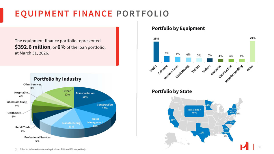 4% 5% 4% Remaining = 46% 11% 10% 4% 8% 4% 4% EQUIPMENT FINANCE PORTFOLIO 30 Transportation 18% Construction 15% Waste Management 13% Manufacturing 13% Retail Trade 6% Professional Services 6% Health Care 6% Hospitality 4% Wholesale Trade 4% Other Services 3% Other 12% Portfolio by Industry (1) Other includes real estate and agriculture of 3% and 2%, respectively. The equipment finance portfolio represented $392.6 million , or 6% of the loan portfolio, at March 31, 2026. Portfolio by Equipment 28% 8% 7% 6% 5% 5% 4% 4% 4% 29% Portfolio by State (1)