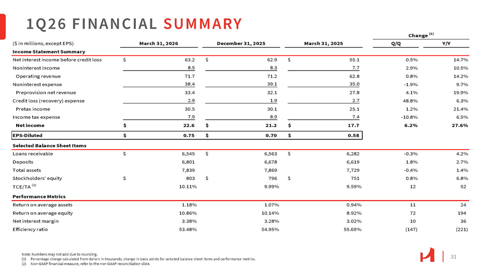 31 1 Q 26 FINANCIAL SUMMARY Note: Numbers may not add due to rounding. (1) Percentage change calculated from dollars in thousands; change in basis points for selected balance sheet items and performance metrics. (2) Non - GAAP financial measure, refer to the non - GAAP reconciliation slide. Y/Y Q/Q March 31, 2025 December 31, 2025 March 31, 2026 ($ in millions, except EPS) Income Statement Summary 14.7% 0.5% 55.1 $ 62.9 $ 63.2 $ Net interest income before credit loss 10.5% 2.9% 7.7 8.3 8.5 Noninterest income 14.2% 0.8% 62.8 71.2 71.7 Operating revenue 9.7% - 1.9% 35.0 39.1 38.4 Noninterest expense 19.9% 4.1% 27.8 32.1 33.4 Preprovision net revenue 6.3% 48.8% 2.7 1.9 2.9 Credit loss (recovery) expense 21.4% 1.2% 25.1 30.1 30.5 Pretax income 6.5% - 10.8% 7.4 8.9 7.9 Income tax expense 27.6% 6.2% 17.7 $ 21.2 $ 22.6 $ Net income 0.58 $ 0.70 $ 0.75 $ EPS - Diluted Selected Balance Sheet Items 4.2% - 0.3% 6,282 $ 6,563 $ 6,545 $ Loans receivable 2.7% 1.8% 6,619 6,678 6,801 Deposits 1.4% - 0.4% 7,729 7,869 7,839 Total assets 6.8% 0.8% 751 $ 796 $ 803 $ Stockholders' equity 52 12 9.59% 9.99% 10.11% TCE/TA (2) Performance Metrics 24 11 0.94% 1.07% 1.18% Return on average assets 194 72 8.92% 10.14% 10.86% Return on average equity 36 10 3.02% 3.28% 3.38% Net interest margin (221) (147) 55.69% 54.95% 53.48% Efficiency ratio Change (1)