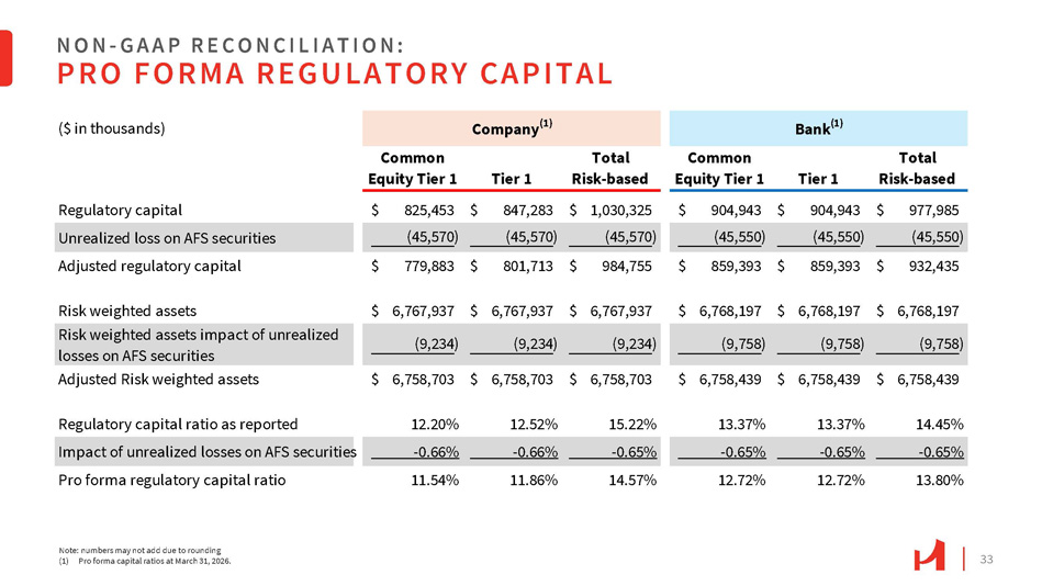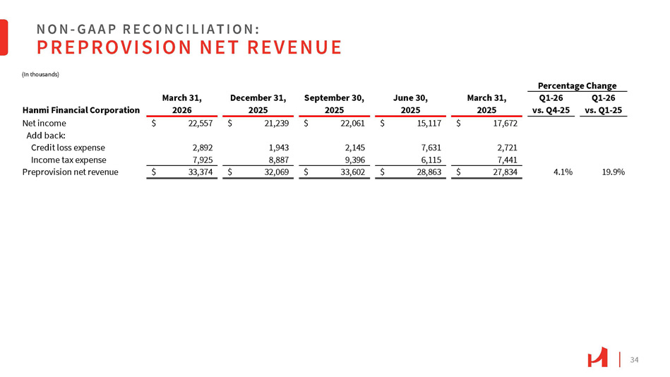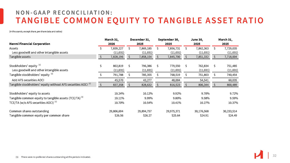32 NON - G A A P R E C O N C I L I A T I O N : TANGIBLE COMMON EQUITY TO TANGIBLE ASSET RATIO (1) There were no preferred shares outstanding at the periods indicated. March 31, 2025 June 30, 2025 September 30, 2025 December 31, 2025 March 31, 2026 Hanmi Financial Corporation $ 7,729,035 $ 7,862,363 $ 7,856,731 $ 7,869,185 $ 7,839,227 Assets (11,031) (11,031) (11,031) (11,031) (11,031) Less goodwill and other intangible assets $ 7,718,004 $ 7,851,332 $ 7,845,700 $ 7,858,154 $ 7,828,196 Tangible assets $ 751,485 $ 762,834 $ 779,550 $ 796,386 $ 802,819 Stockholders' equity (1) (11,031) (11,031) (11,031) (11,031) (11,031) Less goodwill and other intangible assets $ 740,454 $ 751,803 $ 768,519 $ 785,355 $ 791,788 Tangible stockholders' equity (1) 60,035 54,541 48,004 43,277 45,570 Add AFS securities AOCI $ 800,489 $ 806,344 $ 816,523 $ 828,632 $ 837,358 Tangible stockholders' equity without AFS securities AOCI (1) 9.72% 9.70% 9.92% 10.12% 10.24% Stockholders' equity to assets 9.59% 9.58% 9.80% 9.99% 10.11% Tangible common equity to tangible assets (TCE/TA) (1) 10.37% 10.27% 10.41% 10.54% 10.70% TCE/TA (w/o AFS securities AOCI) (1) 30,233,514 30,176,568 29,975,371 29,894,757 29,806,694 Common shares outstanding $24.49 $24.91 $25.64 $26.27 $26.56 Tangible common equity per common share (In thousands, except share, per share data and ratios)